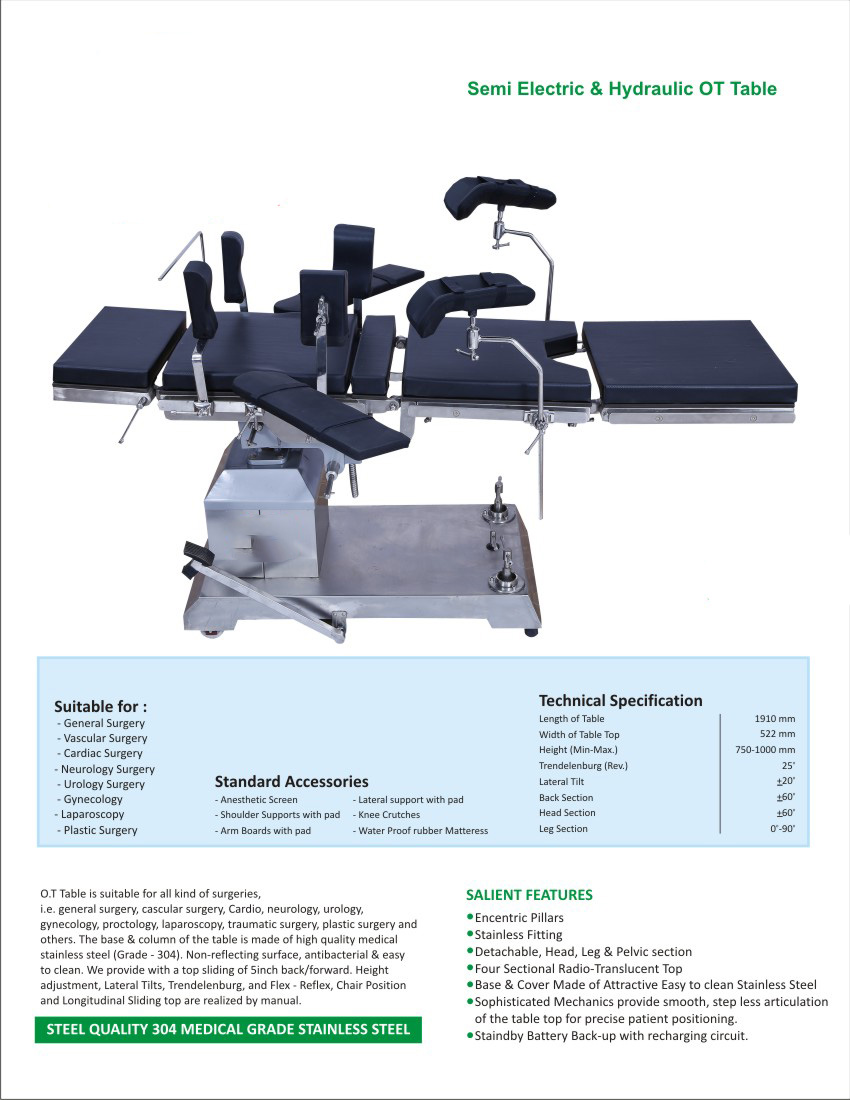 OT Table (Operation Theatre Table) is an essential medical equipment used in hospitals and surgical centers for performing various types of surgeries. These tables are designed to provide maximum comfort, flexibility, and proper positioning of patients during surgical procedures.